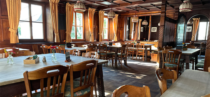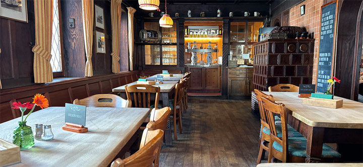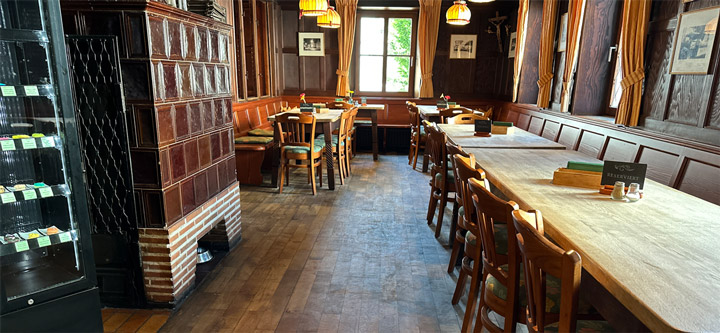 …wurde erstmals 1946 eingerichtete und bis heute im ursprünglichen Zustand erhalten, was sie zu einem besonderen Denkmal vergangener Jahrzehnte macht. Der Kachelofen ist ein handgefertigtes Einzelstück mit aufwendig bemalten Kacheln. Diese zeigen Braumotive und das Zunftzeichen der Brauer.