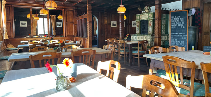 …hängt über der Tür die handgeschnitzte Figur eines schwedischen Fahnenschwingers, dem Markenzeichen der Schwarzbräu Brauerei. Auch hier befindet sich ein mit Holz befeuerbarer Kachelofen. Beide Öfen sorgen an kalten Tagen mit ihrer Wärme und dem leisen Knistern des Holzes für gemütliche Stunden.